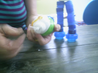Inicie passando o elástico nos dois buracos laterais da garrafa de iogurte deixando o mesmo tamanho para ambos os lados.